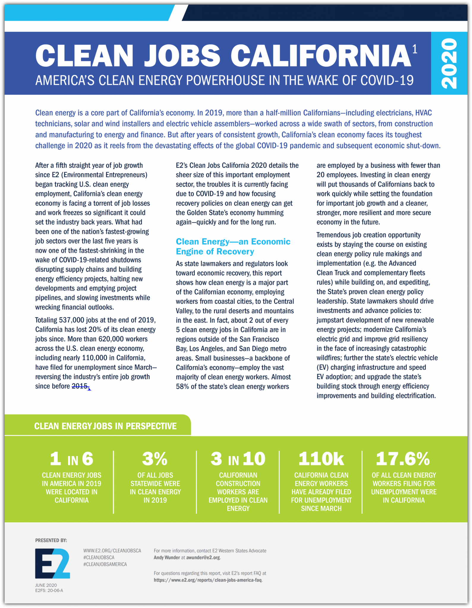 The Clean Jobs California 2020 report is the third iteration of the annual employment analysis. The report expands on data from the 2020 U.S. Energy and Employment Report (USEER) produced by the Energy Futures Initiative (EFI) in partnership with the National Association of State Energy Officials (NASEO), using data collected and analyzed by the BW Research Partnership. The report was released in March 2020 and is available at www.usenergyjobs.org. E2 is a partner on the USEER, the fifth installment of the energy survey first released by the Department of Energy in 2016 and subsequently abandoned under the Trump administration.