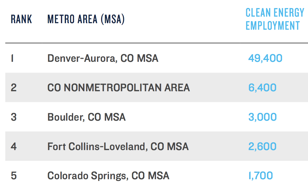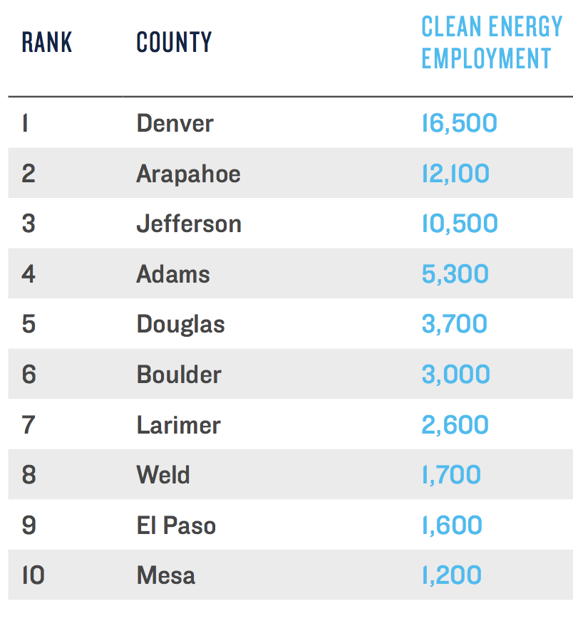 The report shows there are clean energy jobs in every state legislative and congressional district in Colorado, offering more evidence that clean energy is a bipartisan issue that benefits both urban and rural Coloradans. The report also ranks the top 10 counties and top 5 metro areas for clean energy jobs: