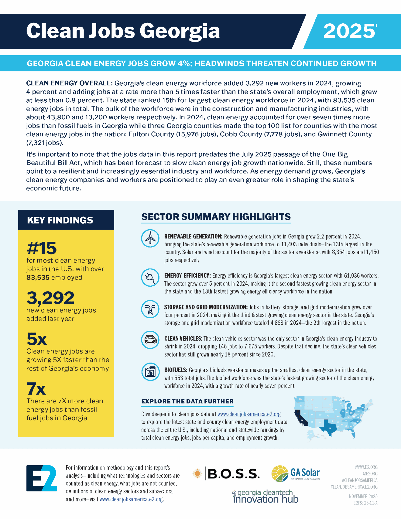 It’s important to note that the jobs data in this report predates the July 2025 passage of the One Big Beautiful Bill Act, which has been forecast to slow clean energy job growth nationwide. Still, these numbers point to a resilient and increasingly essential industry and workforce. As energy demand grows, Georgia’s clean energy companies and workers are positioned to play an even greater role in shaping the state’s economic future.