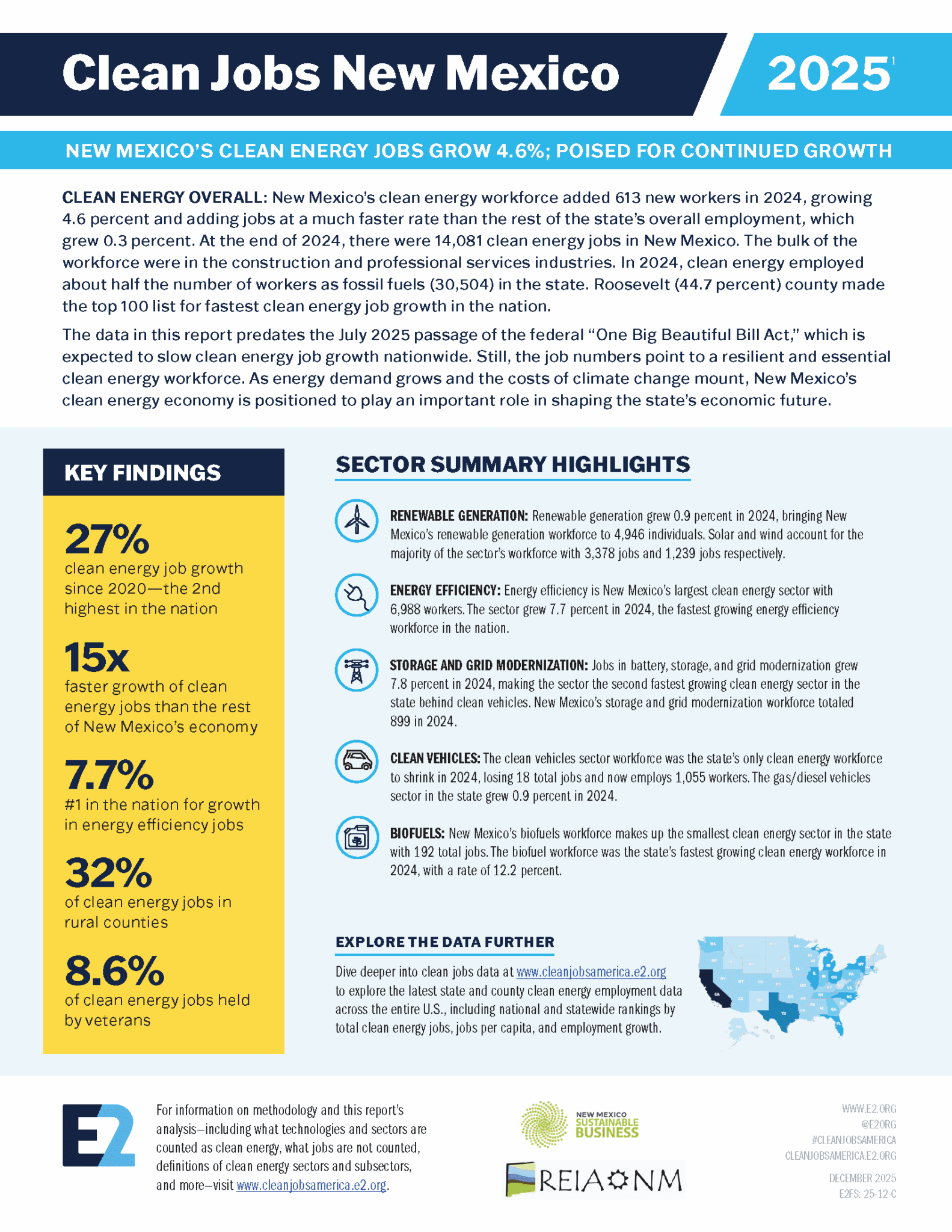 This is the fifth Clean Jobs New Mexico report produced by E2 based on analysis of the USEER, which was first released by the DOE in 2016. E2 was an original proponent of the DOE producing the USEER and was a partner on the reports produced by the Energy Futures Initiative (EFI) and National Association of State Energy Officials (NASEO) after the Trump administration decided to not produce it in 2017.