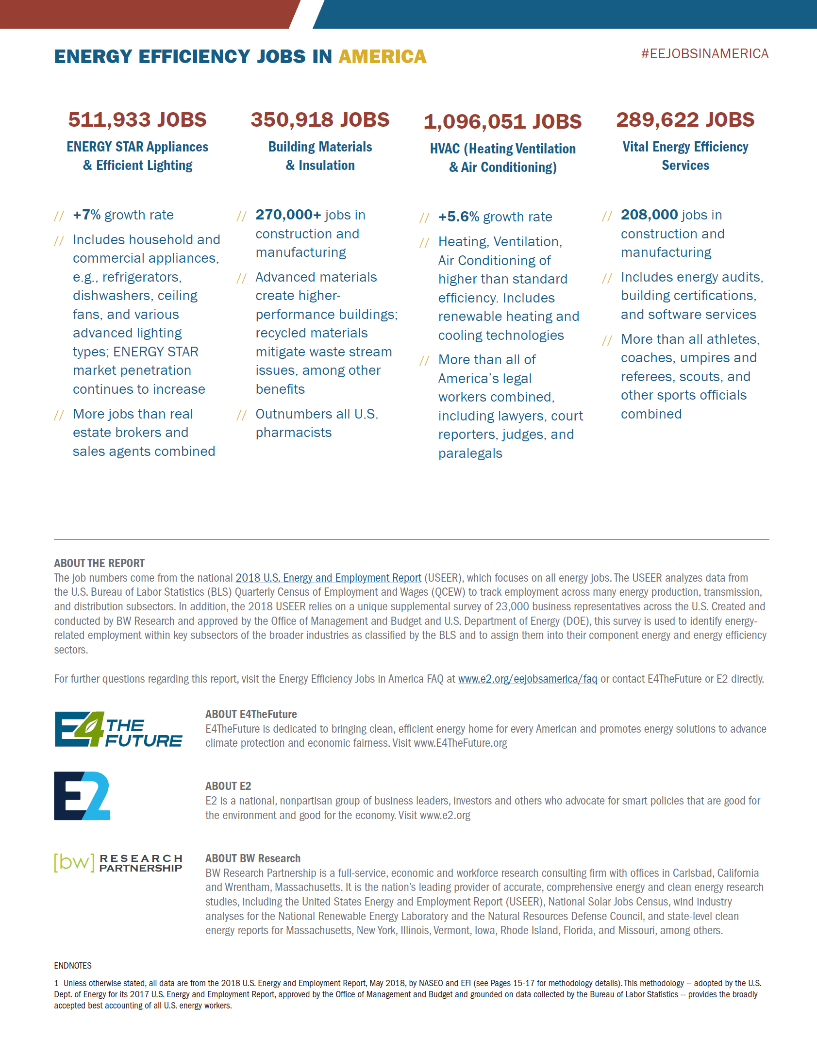 If you are looking for additional insight into E4TheFuture and E2’s Energy Efficiency Jobs in America, including specific info about your county or region or to connect with business leaders in states who support strong clean energy policies, contact E2 Communications Director Michael Timberlake ([email protected]). An FAQ is also available here to answer any questions.